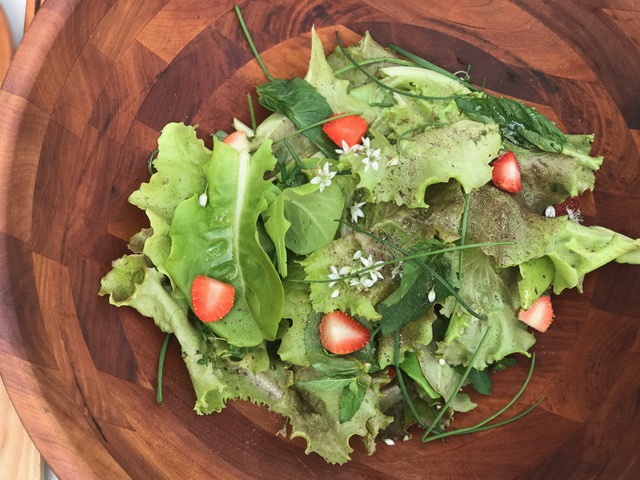A big vinegary green salad would pair nicely, and taste delicious with creamy bites of egg. We’ve harvested a glut of red sail and butter crunch from our garden, and I’ll toss it with my go-to super simple salad dressing. Garnish your salad with herbs (chives, mint, dill or chervil) to give it a fresh flavor. To add a pop of beautiful color, I’ll also set out a big bowl of fresh berries on the table.