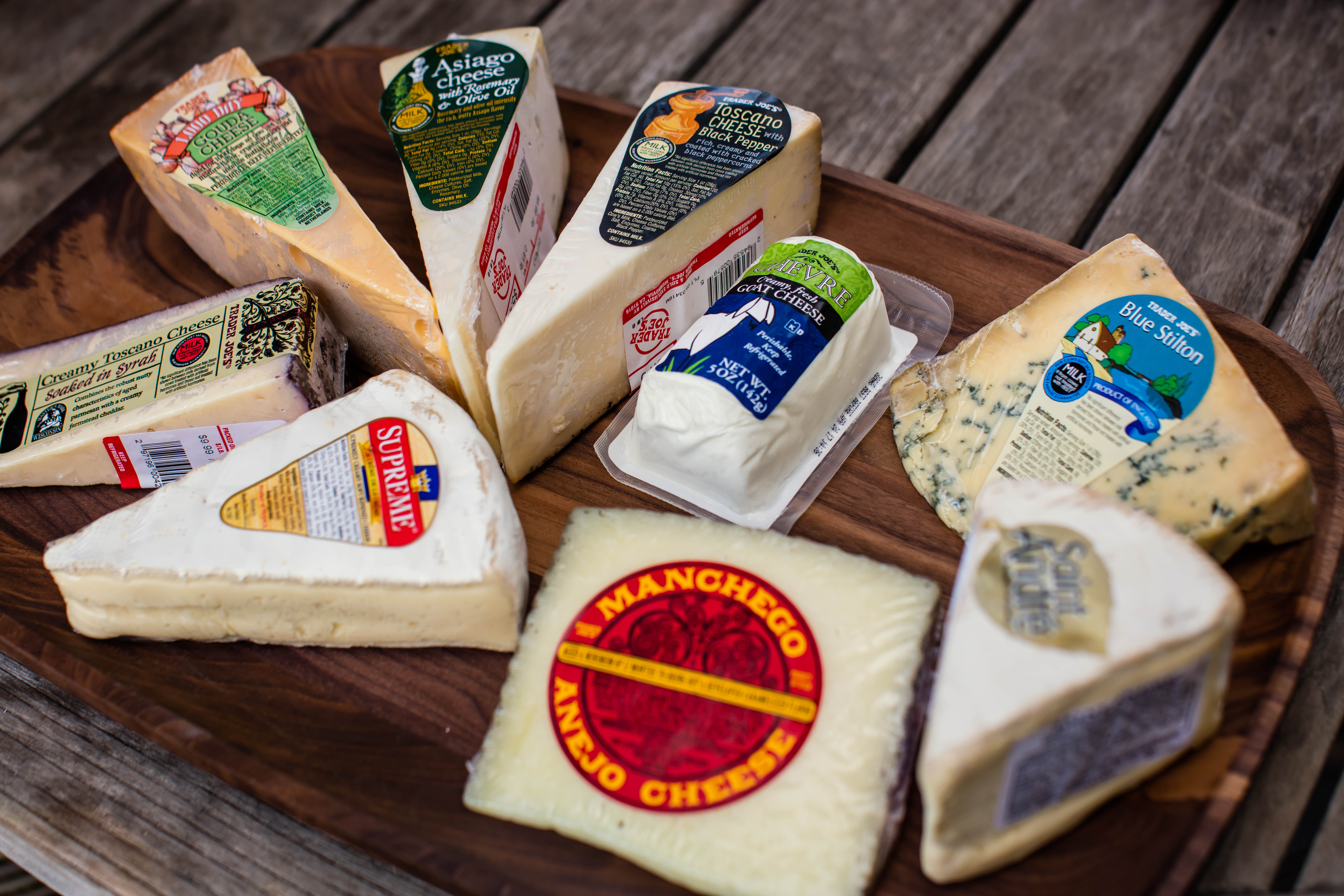 If you’re shopping at Trader Joe’s, most of the cheeses are packaged under their brand. Here’s a good mix: