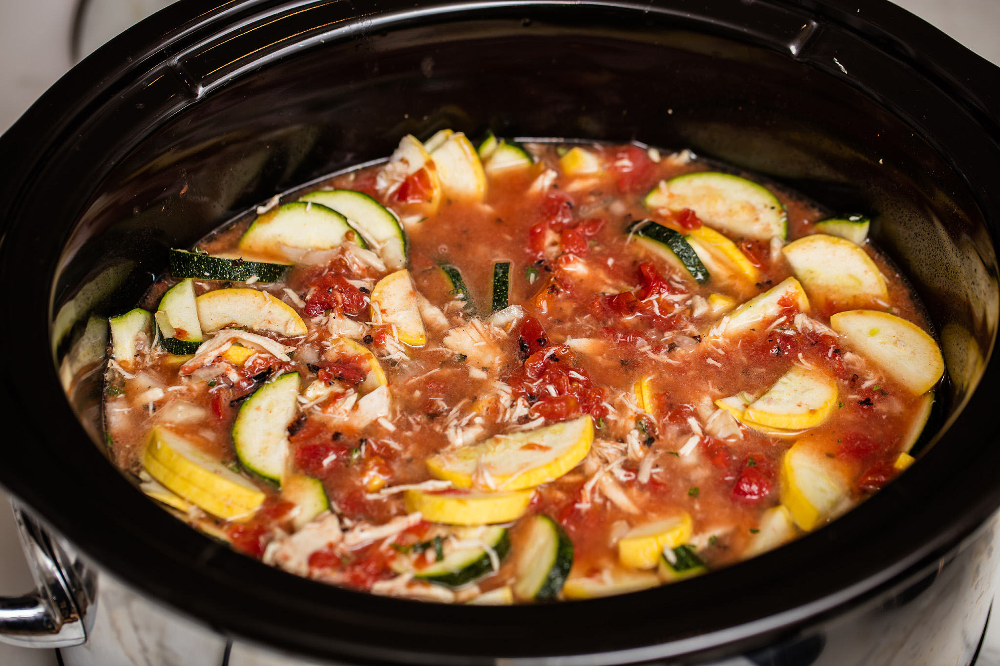 In a large high-sided sauté pan, sauté the vegetables for 5 to 10 minutes until softened. Add the can of crushed tomatoes and let simmer until warm. Transfer the vegetable mixture to a food processor and purée. Set aside.