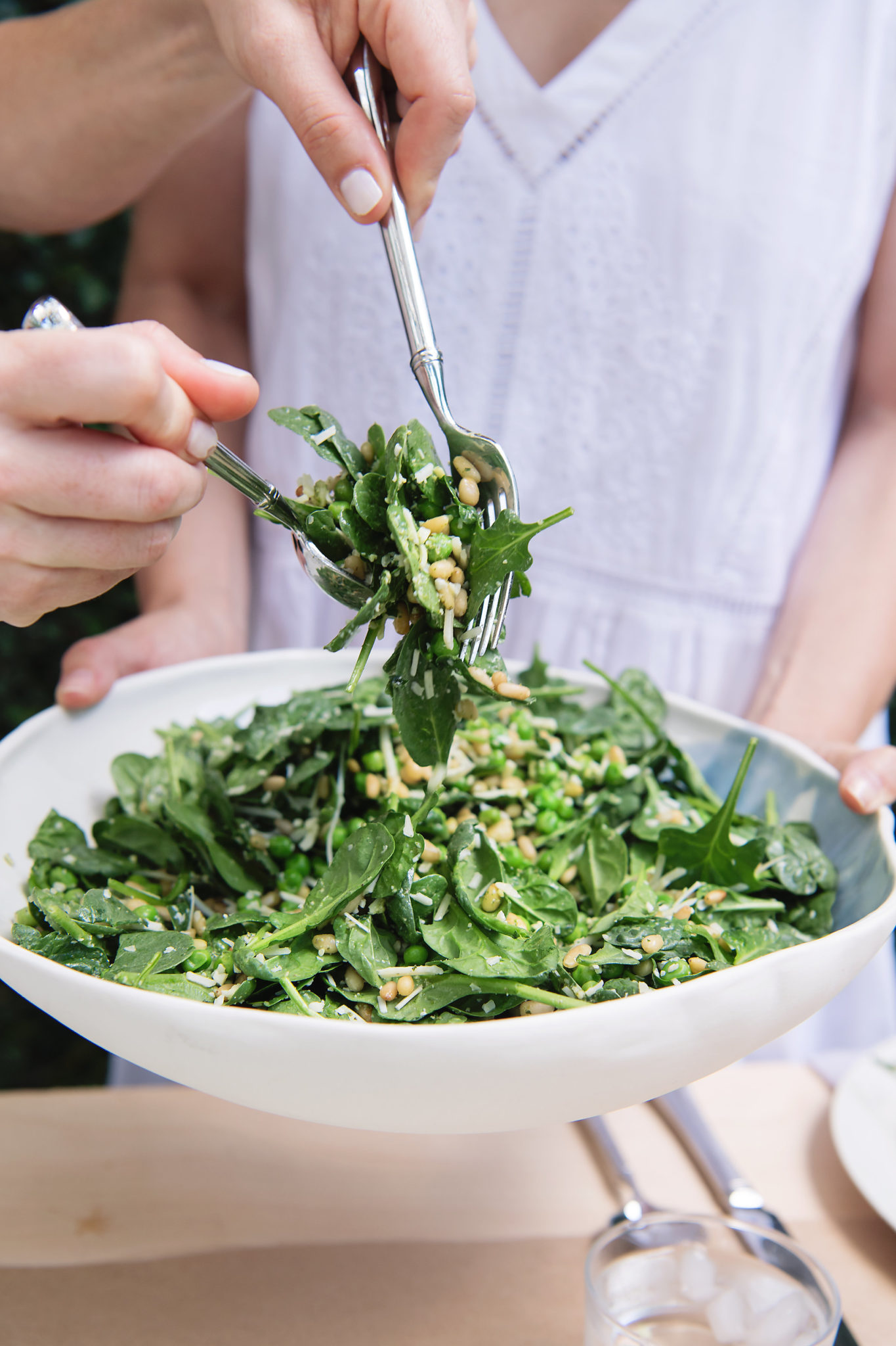 - Place the spinach, peas and pine nuts in a salad bowl. Add the pesto and squeeze the lemon over the salad greens; toss to combine.