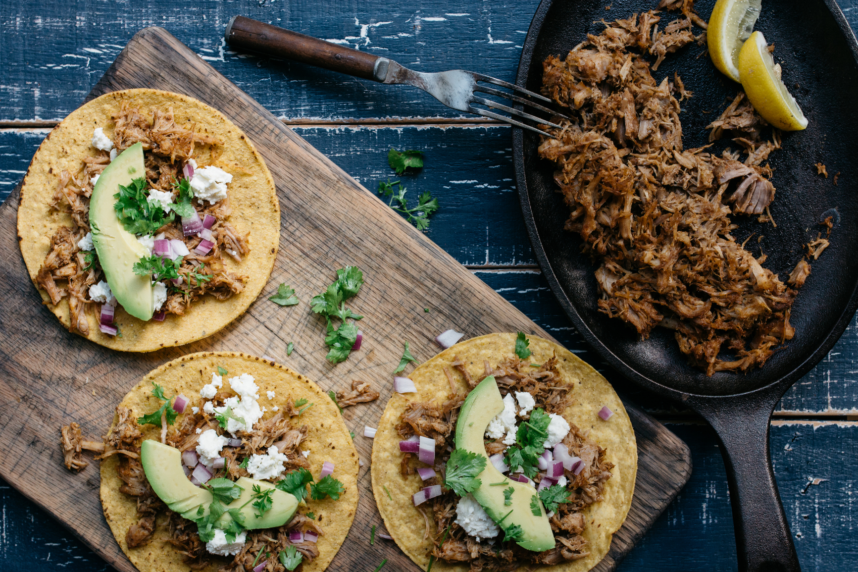 The quality of meat here makes a difference. I love the pork from Yonder Way Farm in Texas, but just go to a reputable butcher near you. Don’t forget the taco fixings, everything goes! Guacamole, pico, tomatillo salsa, crumbled cotija cheese, cilantro, you name it.