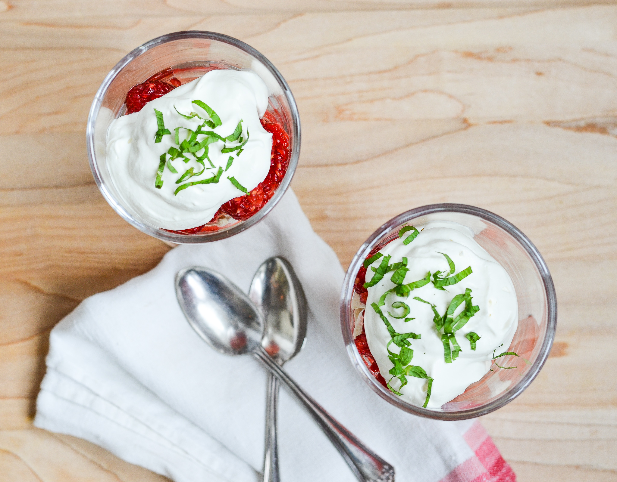 I’ve used raspberries here, mixed with a splash of Prosecco and a little sugar to help them macerate and break down. Feel free to leave the Prosecco out. You don’t need to replace it with a different liquid, just give the berries time to break down in the sugar. And use any berry you prefer, or even finely diced mango or stone fruit.